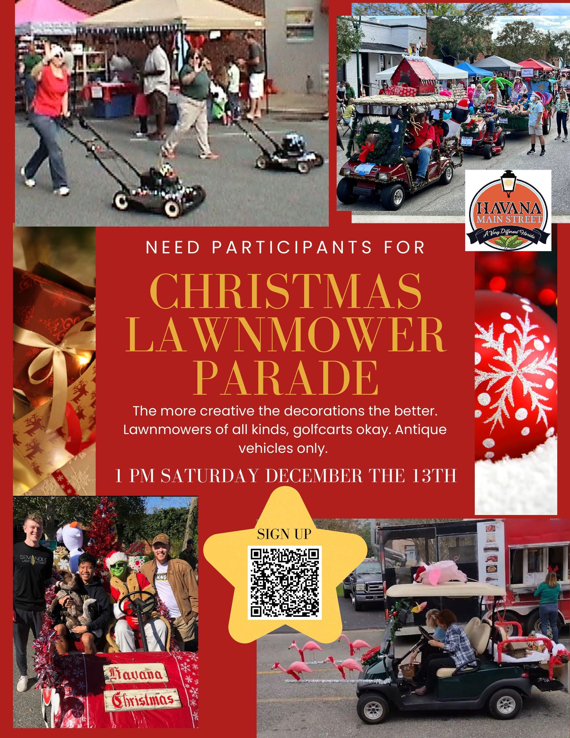 Get ready for one of Havana’s most unique and beloved holiday traditions—our Christmas Lawnmower Parade! We’re looking for fun, festive participants to help bring the streets of Historic Downtown Havana to life.