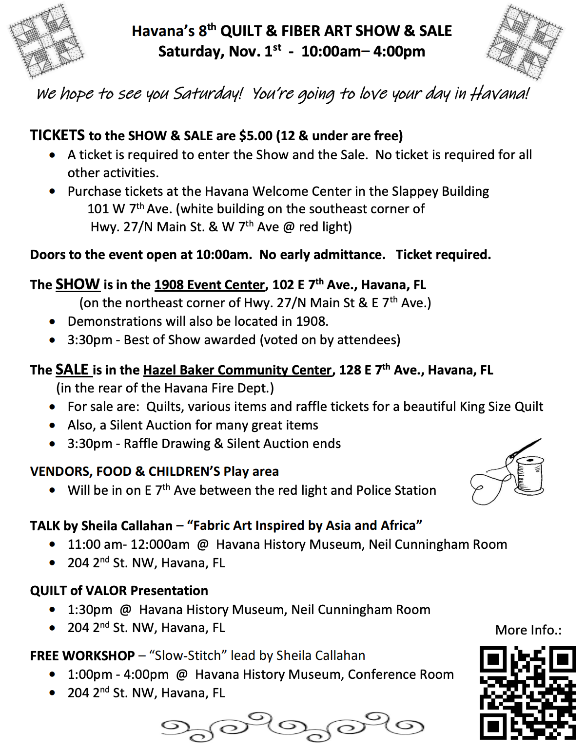 You’re invited to Havana’s 8th Annual quilt sale which has been expanded to a show of local quilter’s work and fiber arts submissions.