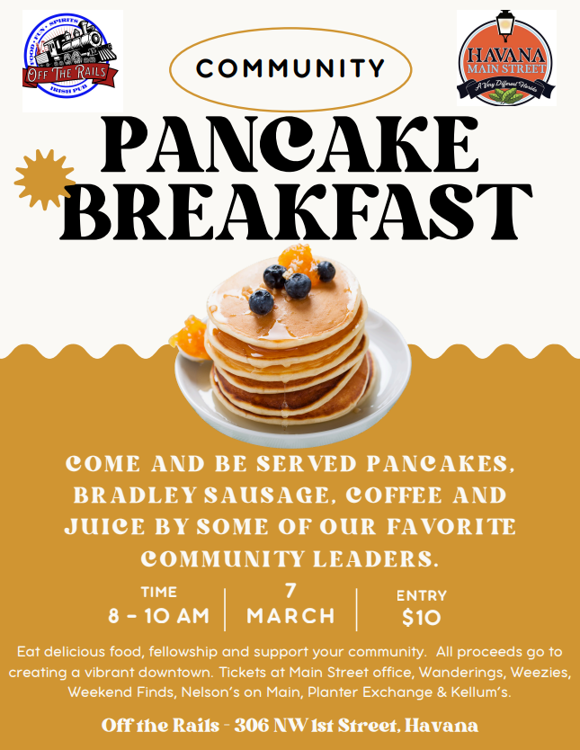COME AND BE SERVED PANCAKES, BRADLEY SAUSAGE, COFFEE AND JUICE BY SOME OF OUR FAVORITE COMMUNITY LEADERS